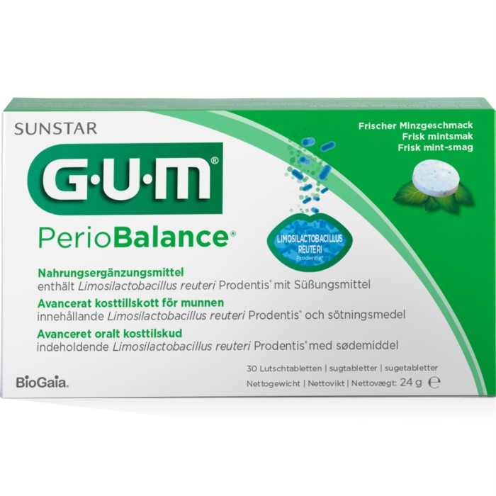 GUM Periobalance sugtabletter är ett kosttillskott för munnen med bakterien Lactobacillus reuteri Prodentis som fäster på munnens slemhinnor. En Periobalance sugtablett innehåller minst 200 miljoner levande Lactobacillus reuteri Prodentis.