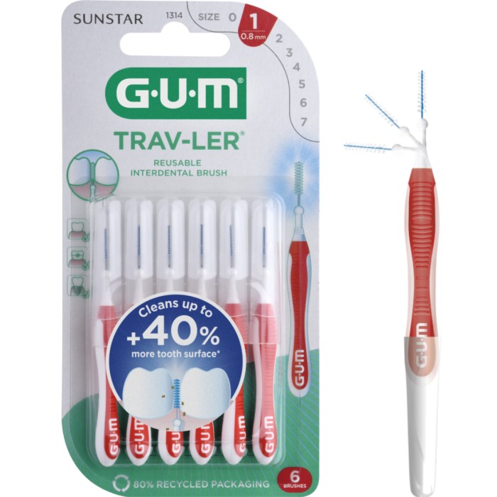 GUM Travler mellanrumstandborstar används för att rengöra och ta bort plack mellan tänderna. Tråden i borsten är belagd med plast för att skydda tandemaljen från skador. Toppen på skaftet är rundat för att skydda tandköttet.