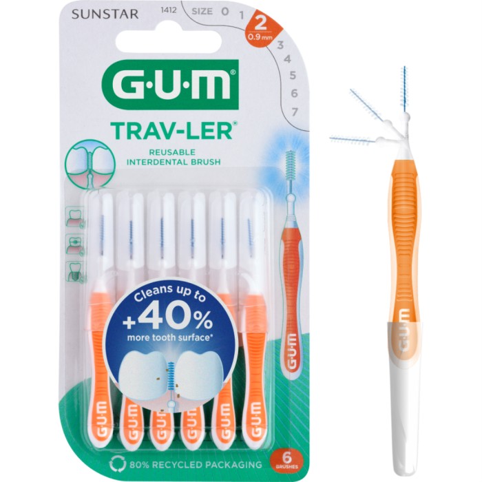 GUM Travler mellanrumstandborstar används för att rengöra och ta bort plack mellan tänderna. Tråden i borsten är belagd med plast för att skydda tandemaljen från skador. Toppen på skaftet är rundat för att skydda tandköttet.