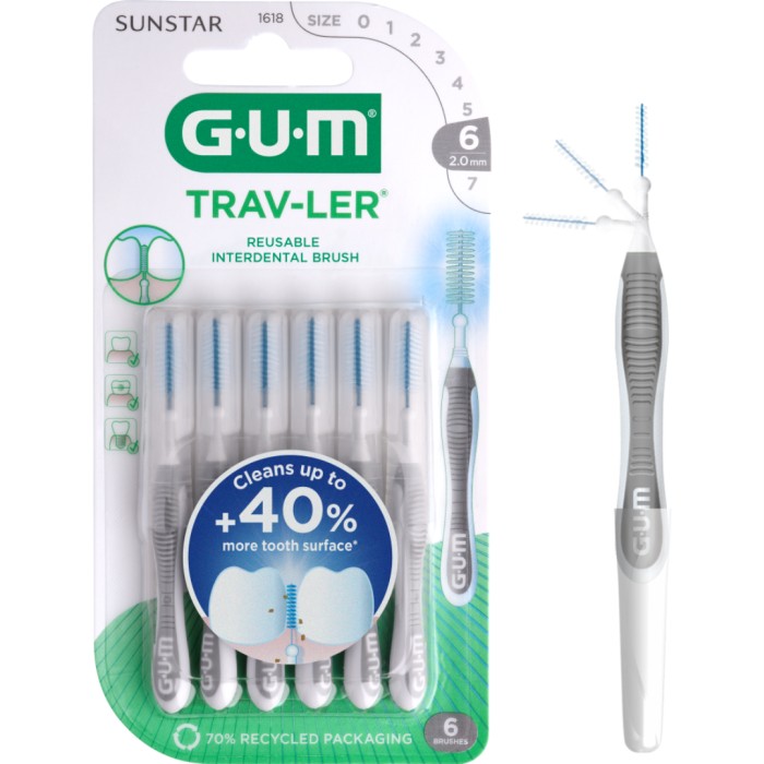 GUM Travler mellanrumstandborstar används för att rengöra och ta bort plack mellan tänderna. Tråden i borsten är belagd med plast för att skydda tandemaljen från skador. Toppen på skaftet är rundat för att skydda tandköttet.