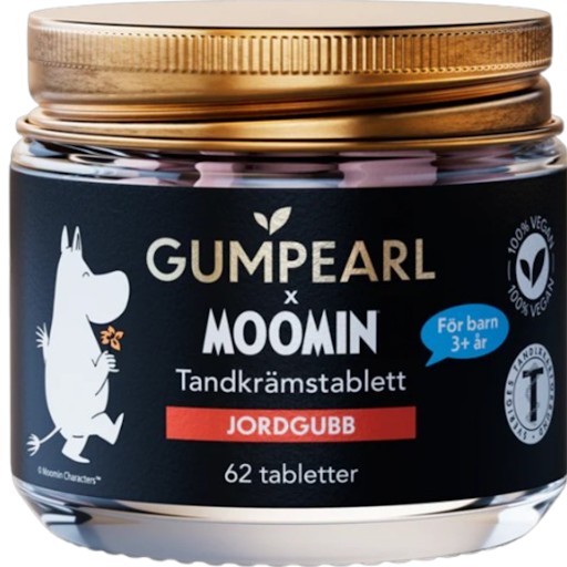 Gumpearl x Moomin Tandkrämstablett Barn Jordgubb är tandkrämstabletter med fluor som fungerar som en färdigdoserad tandkräm. Tabletterna används istället för vanlig tandkräm för att borsta tänderna, 1 tablett per tandborstning. Gumpearl är skonsamma fluortabletter som motverkar karies. Tabletten innehåller 1000ppm fluor samt xylitol och har en smak av jordgubb. Vegansk.