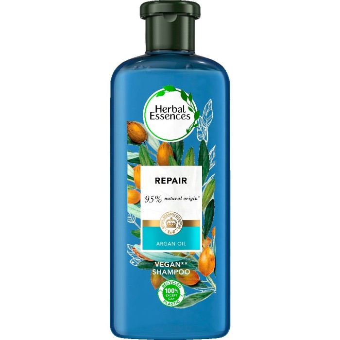 Herbal Essences Argan Oil Schampo är ett hårschampo som reparerar skadat hår och gör det lent och glansigt. Formuleringen innehåller 95% naturliga ingredienser, med ren arganolja från Marocko och aloe vera. Säker att använda även på färgat hår. Förpackningen är återvinningsbar och schampot är veganskt certifierat av PETA.