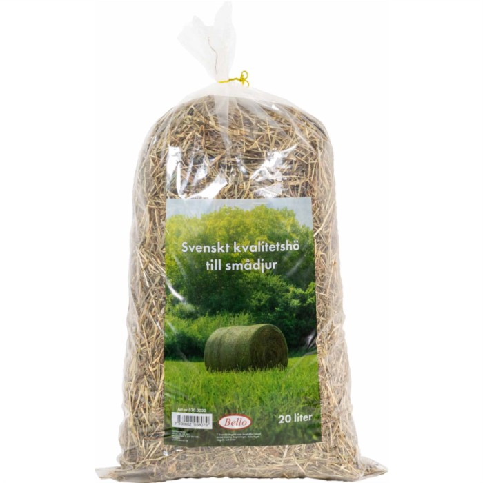 Smakrikt svenskt smådjurshö i 20-liters påse.