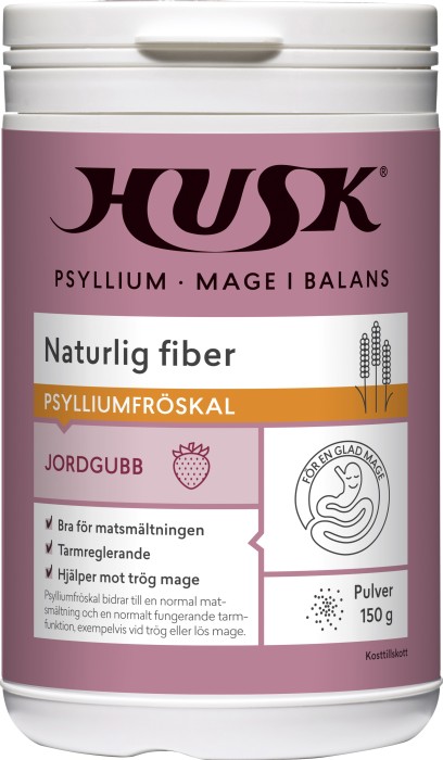 HUSK Mage i Balans Jordgubb är ett kosttillskott med en kombination av psylliumfröskal och jordgubbsflingor. HUSK Jordgubb har en krispig konsistens och en somrig bärsmak, och kan strös på yoghurt och andra kalla rätter. Psylliumfröskal absorberar vätska, sväller och bildar en gel. Psylliumfröskal innehåller 85 % kostfiber och är skonsamma mot magen.