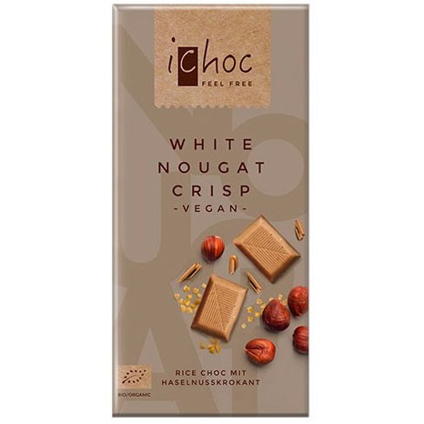 iChoc White Nougat Crisp är en krämig vit veganchoklad med len hasselnötspasta. iChocs chokladkakor är gjorda på en bas av risdryckspulver.