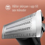 Style Masters tre utbytbara kam-tillbehör (1 mm, 3 mm, 5 mm) gör det möjligt att trimma uppåt eller nedåt. Den har ett utbytbart blad helt i metall som håller för upp till 6 månaders rakning, ett rörligt konturhuvud för anpassning på svåråtkomliga områden och ett smalt 360° gummigrepp för maximal precision.