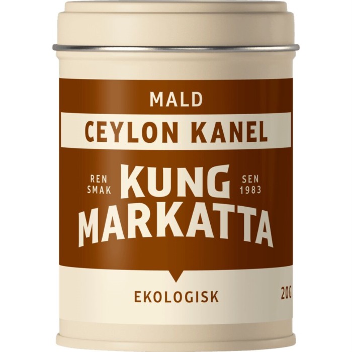 Kung Markatta Mald Ceylonkanel är handskuren Ceylon-kanel från Sri Lanka med en intensiv och aromatisk smak. Detta är en äkta kanel odlad i några av världens bästa jordbruksområde. Har ett lågt kummarin-innehåll. Kanelen är ekologisk.