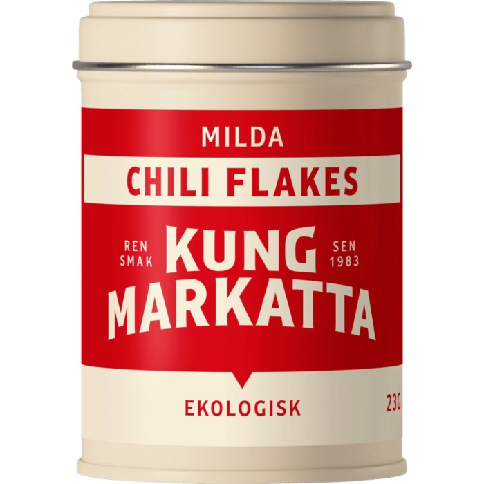 Kung Markatta Milda Chiliflakes är ekologisk chili som är varsamt soltorkad, och innehåller både frukt och frön. Denna chili har en styrka på 3000-4000 på Scoville-skalan.