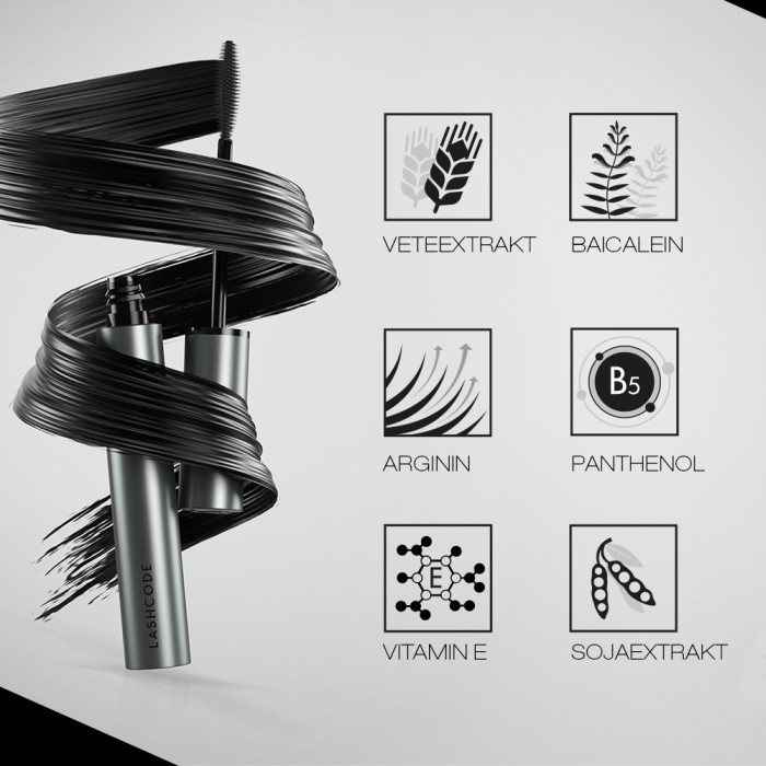 Lashcode mascara är en svart mascara som separerar fransarna och omsluter dem med djupt svart pigment. Mascaran förlänger och ökar fransarnas volym med ett enda svep av borsten. Formuleringen innehåller ultrasvart pigment och ingredienser som sojaextrakt, veteextrakt och pantenol.