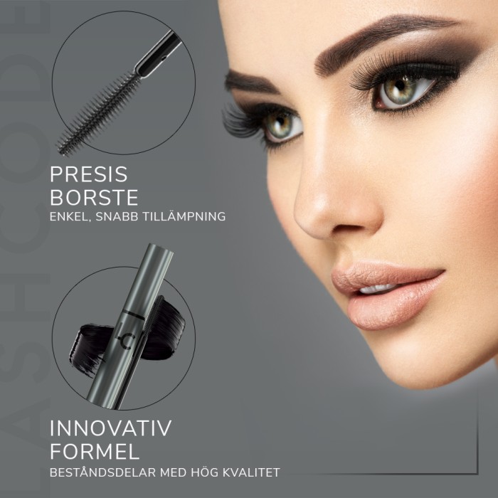 Lashcode har en noga utformad, ergonomisk borste som når varje ögonfrans och omsluter även de små fransarna i hörnen med djupt svart pigment. Täck först de längsta fransarna med den bredaste delen av borsten. Använd sedan toppen av borsten för att definiera hörnfransarna för en solfjädereffekt. Håll borsten horisontellt och applicera mascaran på de undre fransarna med en sicksackrörelse.