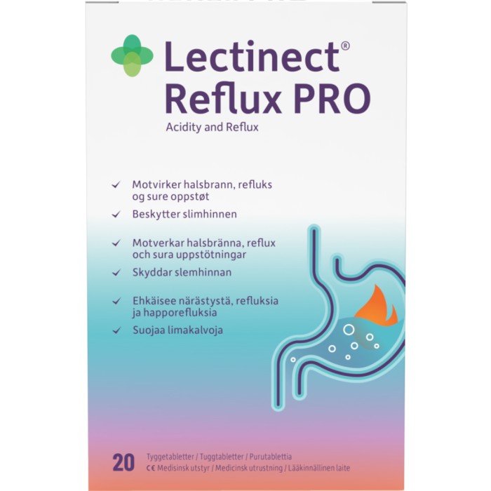 Lectinect Reflux PRO tuggtabletter är en medicinteknisk produkt som motverkar symtom på irritation i magslemhinnan, halsbränna och sura uppstötningar.