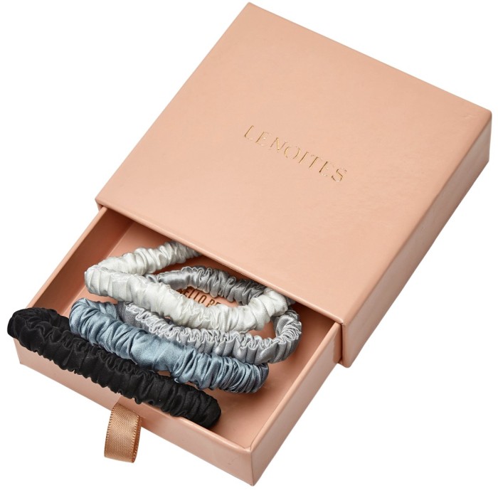 Lenoites smala scrunchies i siden är fina och tidlösa scrunchies av 100 % mullbärssilke. Dessa lyxiga scrunchies blir som smycken för håret, och håller det på plats utan att skava på det yttre lagret av hårståna.