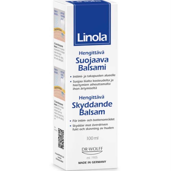 Linola Skyddande balsam skyddar öm och irriterad hud orsakat av svett, avföring, och urin. Kan också användas för att skydda vid friktion som kan ge skavsår, t ex vid cykling eller vid användning av kläder som skaver eller trosskydd. Kan användas för att förhindra lårskav.