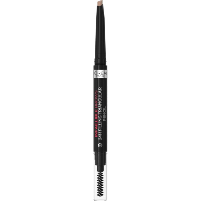Med L'Oréal Paris Infaillible Brows 24H Filling Triangular Pencil kan du skapa definierade ögonbryn och få ett resultat som varar i upp till 24 timmar*. Formuleringen har en mjuk och krämig textur och pennan har en trekantig spets som gör det enkelt att fylla i brynen. Pennan har en borste i andra änden som du kan använda för att forma och styla.