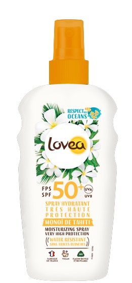 Lovea Moisturizing Spray SPF50+ Monoi de Tahiti är en solspray med högt skydd och en doft av Tahiti Monoi. Solskyddet har ett solfilter som är "Ocean Friendly" och följer Hawaiis Coral Reef Law. Ger ett högt skydd som skyddar huden mot UVA- och UVB-strålar.