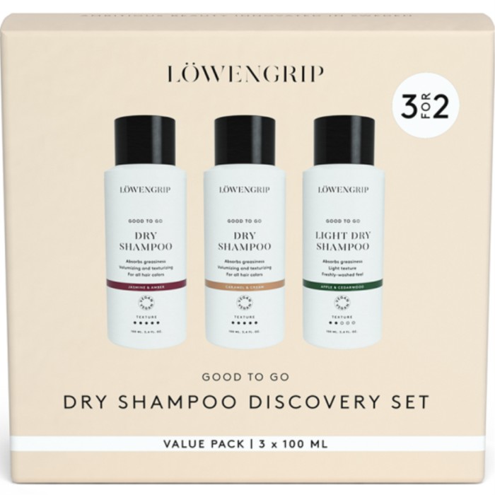 Good To Go Dry Shampoo Discovery Set från Löwengrip är ett set som innehåller tre av varumärkets prisbelönta torrschampon, som ger håret en uppfräschning mellan hårtvättar. De passar alla hårfärger och är veganska.