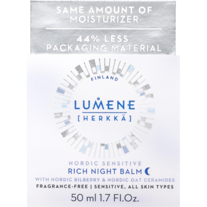 Lumene Nordic Sensitive Rich Night Balm är en fyllig och parfymfri nattkräm som lugnar känslig hud och förstärker en skadad fuktbarriär. Krämen är kliniskt testad på känslig hud och utvecklad i samarbete med finska Allergi, Hud och Astmaförbundet.