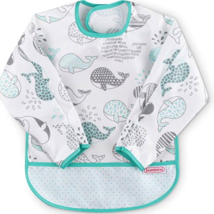 Bambino Eat-n-play är en långärmad haklapp som passar perfekt för kladdiga måltider. Haklappen skyddar både mage och armar, och är tillverkad i ett kraftigt men följsamt bomullstyg med smutsavisande yta som är lätt att torka av. Haklappen har ett reglerbart kardborrefäste i nacken och en rejäl ficka framtill som fångar upp spill.
