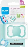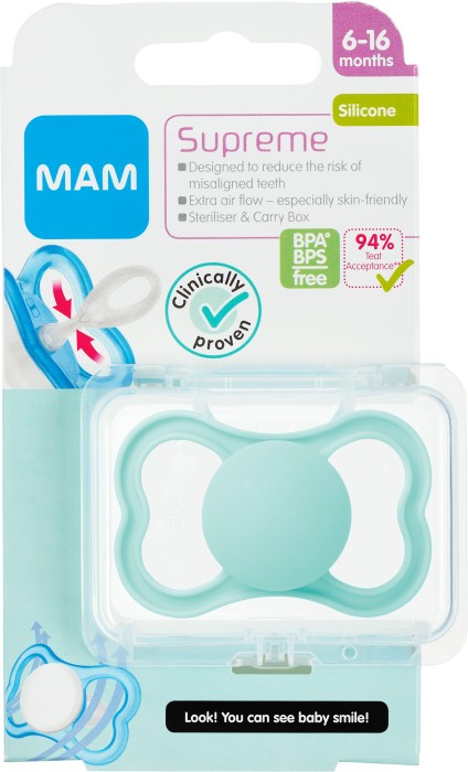 MAM Supreme napp för barn 6-16 månader har en 60% tunnare sugdel än många vanliga sugnappar. Nappen är utvecklad i samarbete med tandregleringsspecialister och barnläkare för att minska trycket på barnets käke och tänder. MAM Supreme är mjukare och mer flexibel än de flesta andra sugnappar, och har en öppen sköld för att ge maximalt med luftflöde till barnets hud och motverka hudirritation.