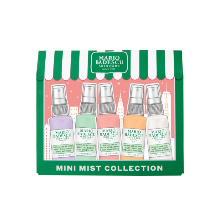 Mini Mist Collection från Mario Badescu är ett kit med fem ansiktssprayer med doft av rosvatten, lavendel, gurka, apelsinblomma och kokosnötsvatten. Dessa ansiktssprayer återfuktar, föryngrar, fräschar upp och ger huden en naturligt strålande lyster.