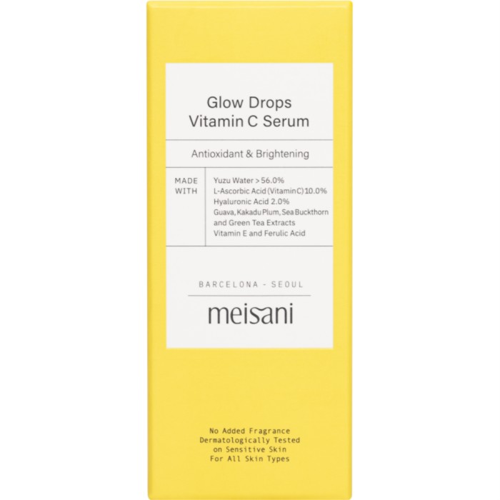 Meisani Glow Drops är ett vitamin C-serum för ansiktet. Kan användas för att motverka fotoåldrande och mörka fläckar, ljusa upp huden och skydda mot fria radikaler. Serumet innehåller 10% ren vitamin C, inkapslat i pärlor, vilket ger större stabilitet, försenad oxidation och djup hudgenomträngning. Passar alla hudtyper.