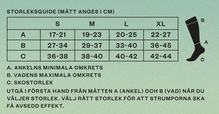 För att välja rätt storlek ska du utgå från tre mått: Ankelns omkrets, vadens omkrets och din skostorlek. (Se bild för mer information.)