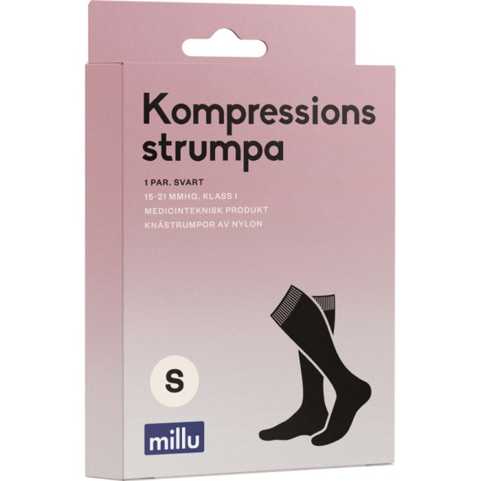 Millu Kompressionsstrumpa är en strumpa i svart nylon som kan användas för att förebygga och lindra åderbråck samt svullna ben, till exempel under graviditet. Lämpliga att använda vid längre tids stillasittande eller stående, till exempel vid stillasittande arbete, eller vid långa resor för att förebygga blodproppar.