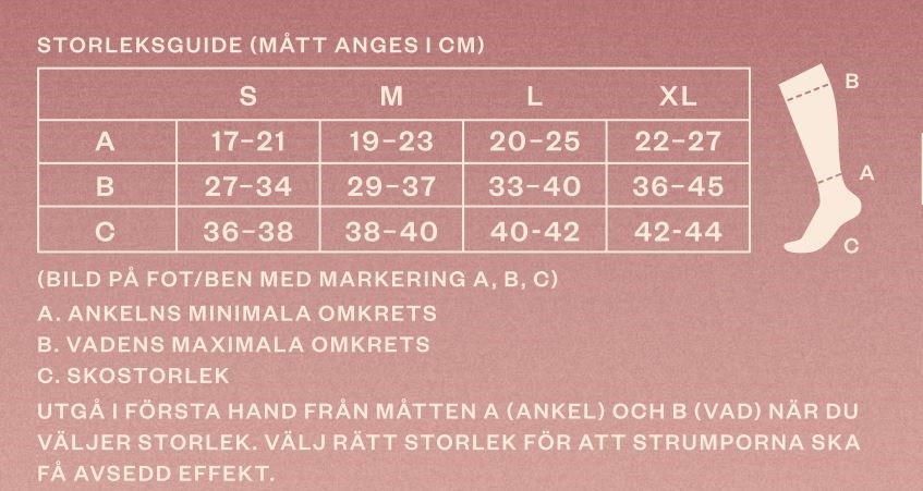 Kontrollera att strumpan hel och ren innan användning. Se till att strumpan är rak och stoppa in handen ända till hälen. Vänd strumpan ut och in ner till hälen. Töj ut skaftet och sätt strumpan på foten. Se till att hälen sitter rätt och att strumpan inte är vriden. Vänd tillbaka strumpskaftet och dra det uppåt längs vaden. Dra upp det till ungefär 2,5 cm från knävecket. Välj rätt storlek för att strumporna ska få avsedd effekt.
