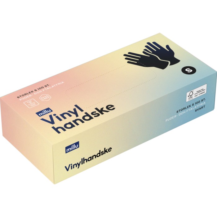 Millu Vinylhandske är tunna vinylhandskar för medicinskt bruk. Används för arbete inom omvårdnad, provtagning, städning samt där kontakt med vissa kemikalier riskeras. Lämplig för hantering av livsmedel, dock ej feta livsmedel.