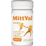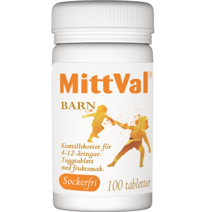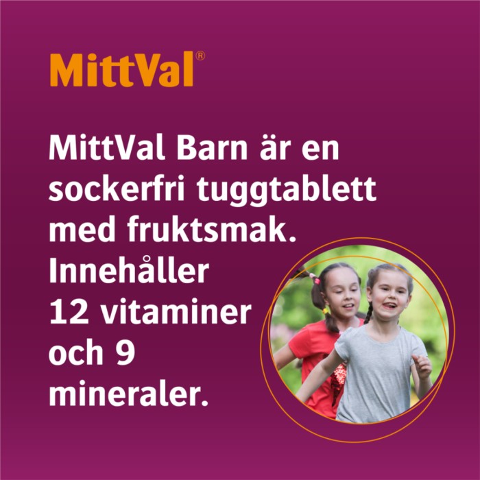 MittVal Barn är ett kosttillskott och multivitamin framtaget för barn mellan 4-12 år. Den sockerfria tabletten innehåller vitaminer och mineraler som bidrar till normal benstomme, immunsystem och normala tänder. Ett vitamintillskott utan tillsatt socker.