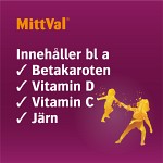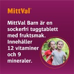MittVal Barn innehåller vitaminer och mineraler som bidrar normal benstomme, immunsystem och normala tänder - bland annat D-vitamin för skelettet och C-vitamin för immunsystemet. Tuggtabletten är lätt att tugga samt fri från onödiga tillsatser. Ett enkelt sätt att säkerställa att barnet får i sig viktiga näringsämnen varje dag.