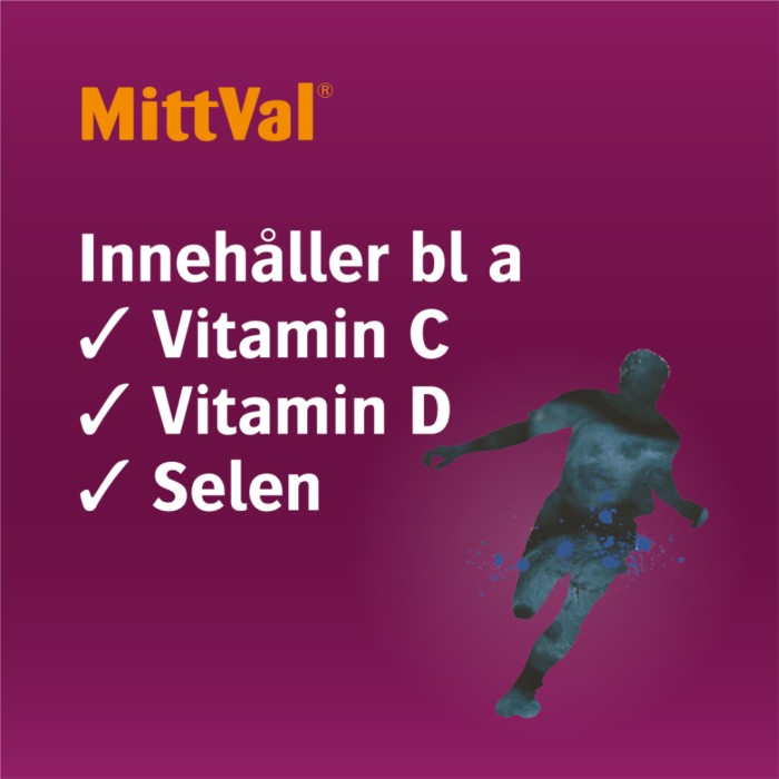 MittVal Man är ett kosttillskott och multivitamin särskilt anpassat för mäns näringsbehov. Varje tablett innehåller vitaminer och mineraler som magnesium och kalcium som bidrar till normal muskelfunktion och immunsystemets normala funktion.