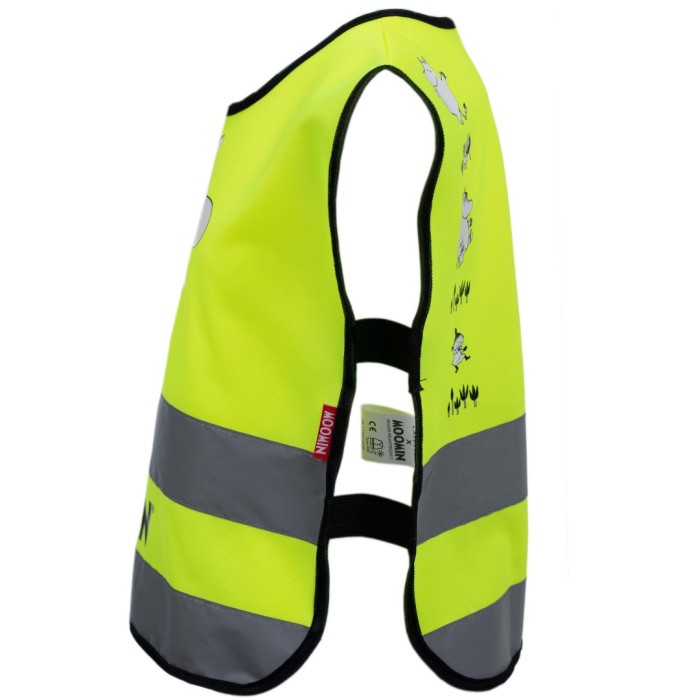 Reflexväst med Mumin-motiv, storlek L-XL. Västen är neongul och har reflexband runt om, så att du ska synas i mörkret från alla håll. Denna väst har dragkedja.