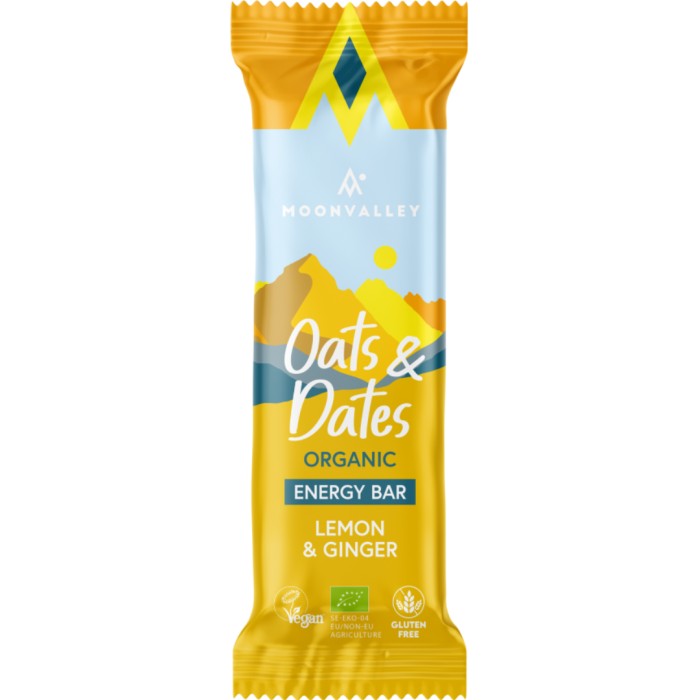 Moonvalley Oats & Dates Energy Bar Lemon & Ginger är en energibar med smak av citron & ingefära. Kanske den perfekta energikällan för att ta dig den där sista biten i mål på en tävling, eller att ha med i packningen en lång dag ute i naturen.
