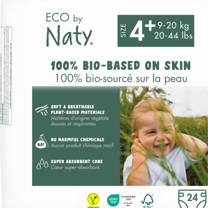 Natys blöjor är certifierad 100% biobaserad i de material som rör huden (toppskikt, yttre lager, benfickor och öron), och är tillverkad utan fossila plaster. Blöjorna är supermjuka och den växtbaserade ytan ger en mjuk känsla samtidigt som den är andningsbar och skonsam för känslig hud. Dermatologiskt testad av Dermatest.