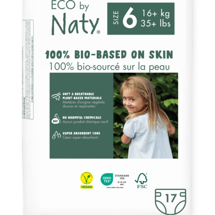 Natys blöjor är certifierad 100% biobaserad i de material som rör huden (toppskikt, yttre lager, benfickor och öron), och är tillverkad utan fossila plaster. Blöjorna är supermjuka och den växtbaserade ytan ger en mjuk känsla samtidigt som den är andningsbar och skonsam för känslig hud. Dermatologiskt testad av Dermatest.