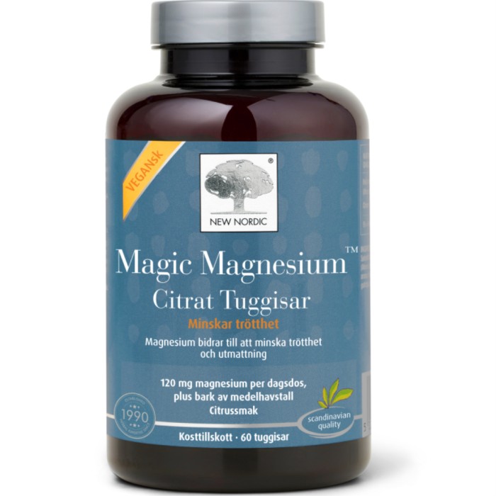 New Nordic Magic Magnesium™ Citrat Tuggisar är ett kosttillskott i form av en välsmakande vegansk tuggis som innehåller magnesiumcitrat och extrakt av bark från medelhavstall.