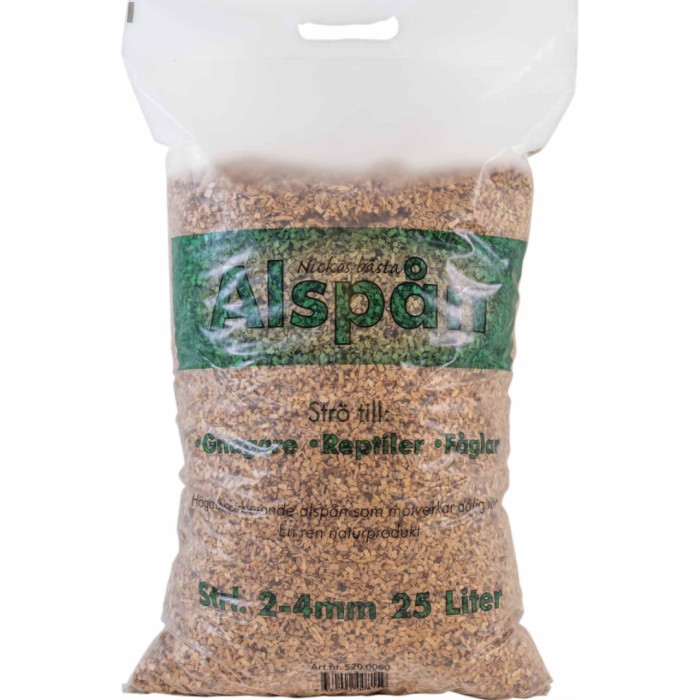 Nickos Alspån 2-4 mm strö till gnagare, reptiler och fåglar är högabsorberande alspån som motverkar dålig lukt. En ren naturprodukt tillverkat av al – en naturlig och obehandlad råvara. Fri från tillsatser och kemikalier. Kornstorlek: 2–4 mm. Volym: 25 liter.