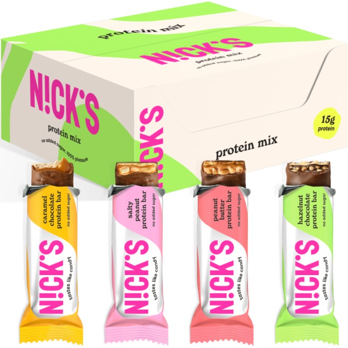 En låda med 9 blandade proteinbars i 4 olika smaker, från Nicks. Mixlådan innehåller 9 stycken av Nicks proteinbars som smakar lika gott som godis, men som dessutom innehåller 30% protein. Alla bars är täckta av len mjölkchoklad och innehåller inget tillsatt socker. Innehåller sötningsmedel.