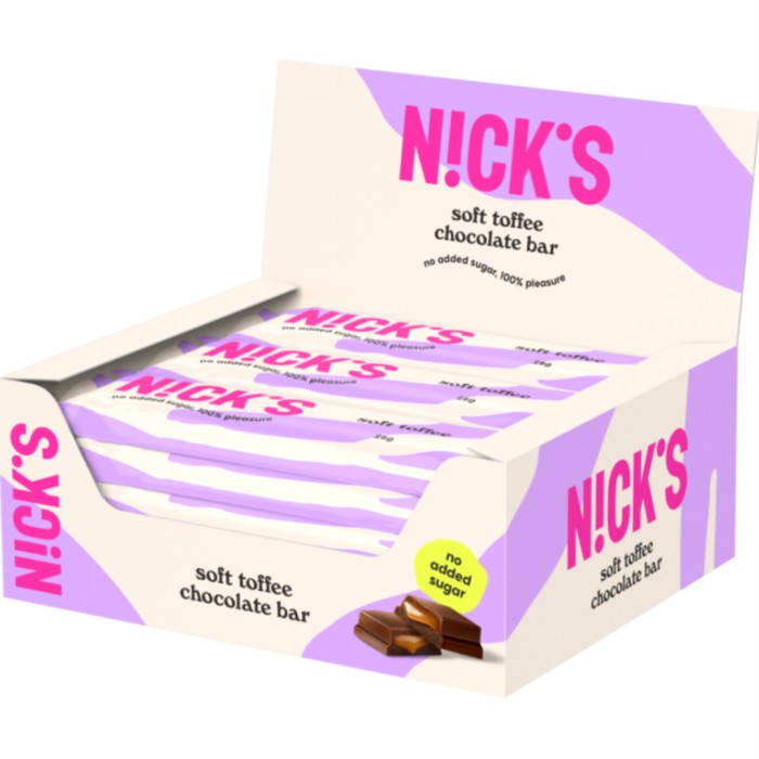 Nicks Soft Toffee är mjuk toffee (karamell) doppad i mjölkchoklad. Utan tillsatt socker, palmolja och gluten. Sötad med sötningsmedel.
