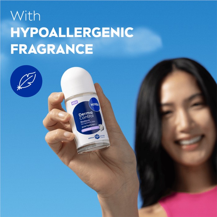 NIVEA Derma Control Restore Deo Antiperspirant är en deodorant som är speciellt framtagen för känslig hud, och har en hypoallergen doft som minimerar risken för irritation. Den unika formuleringen med hyaluronsyra och vitamin E lugnar effektivt irriterad hud efter rakning och ger mjukare armhålor och en behaglig känsla vid användning.