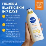 NIVEA Q10 Vitamin C Body Lotion är en kroppslotion som är berikad med Kollagen Boost Komplex (komplex testat in-vitro på hudceller) och innehåller 99,5 % ren Q10 och C-vitamin. Denna hudlotion stärker och förbättrar hudens elasticitet märkbart på 10 dagar. Den vårdande formuleringen återfuktar huden i upp till 48 timmar och lämnar en behaglig doft. Niveas kroppslotion är dermatologiskt testad och passar för normal hud. Den uppstramande och intensivt återfuktande formuleringen passar för daglig användning. Denna lotion har fått en ny förbättrad flaska med mindre plast jämfört med tidigare: 50% återvunnen plastflaska (exklusive kork).
