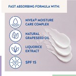 NIVEA Soothing Day Cream är en återfuktande dagkräm med SPF15 som ger ett visst skydd mot solens strålar. Ansiktskrämen har en vegansk formulering (utan animaliska ingredienser). Den har en icke-fet formulering och gör huden silkeslen och reducerar rodnad, torrhet, stramhet och irritation.