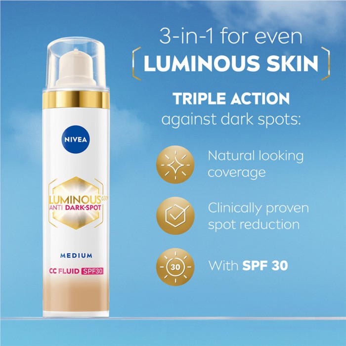 NIVEA LUMINOUS630® Anti Dark-Spot CC Fluid SPF30 Medium är en färgad dagkräm som ger en jämn hud med lyster tack vare den trippelverkande formuleringen: