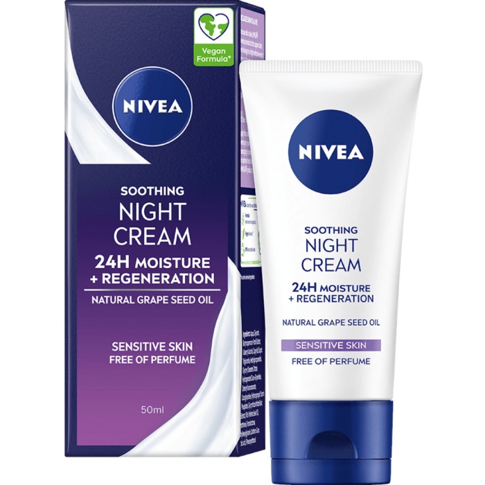 NIVEA Soothing Night Cream är en nattkräm framtagen för känslig hud. Ansiktskrämen har en formulering med druvkärnolja, lakritsextrakt och provitamin B5 och återfuktar huden i upp till 24 timmar, och balanserar hudens egen fuktnivå. Ansiktskrämen stödjer hudens naturliga motståndskraft och återuppbyggnad samt återfuktar huden intensivt under natten.