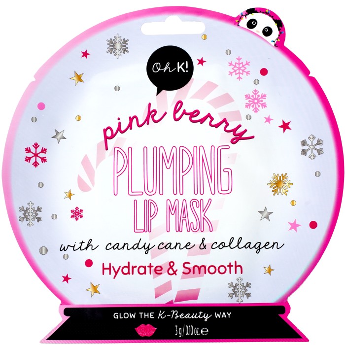 Oh K! Pink Berry Plumping Lip Mask är en mask för läpparna. Masken gör läpparna djupt återfuktande och gör att de känns mjuka och välvårdade. Den rosa glittriga läppmasken är formad för att sitta perfekt på läpparna och kapslar in formulan för en maximal absorption av essensen. Innehåller kollagen som hjälper till att reducera och släta ut fina linjer och rynkor. Har en lekfull, säsongsinspirerad doft av polkagris.