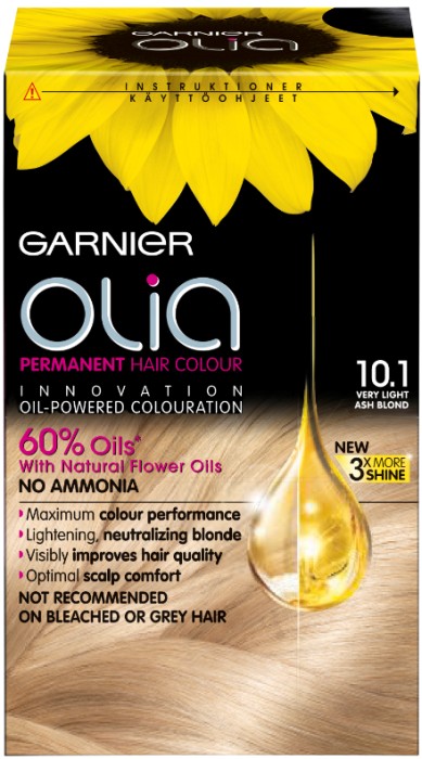 Olia Very Light Blond Ash Blonde 10.1 från Garnier är en permanent hårfärg baserad på olja. Olia ger en maximal färgprestation, synlig förbättring av hårkvaliteten och komfort till hårbotten. Olia 10.1 är en mycket ljusblond, kall hårfärg som passar för naturligt ljusblont till mörkblont hår. (Resultatet beror på din naturliga hårfärg.)