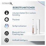 Genius 20200S har Gum Guard-teknik, 360 SmartRing och trycksensor. Gum Guard skyddar ditt tandkött och 360 SmartRing låter dig välja din favoritfärg på handtagets LED-lampa. Trycksensorn varnar dig och minskar hastigheten när du borstar för hårt samt visar var du borstar för mycket för en varsammare tandborstningsrutin. Eltandborsten levereras med ett litiumjon-batteri som räcker i mer än två veckor på en full uppladdning.