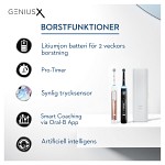 Oral-B Genius X i duo-pack med två stycken eltandborstar och en laddare. Genius X är en elektrisk tandborste med rörelsesensorer och artificiell intelligens som identifierar ditt sätt att borsta för att guida dig till bästa borstresultat. En eltandborste tar bort upp till 100% mer plack än en manuell tandborste.