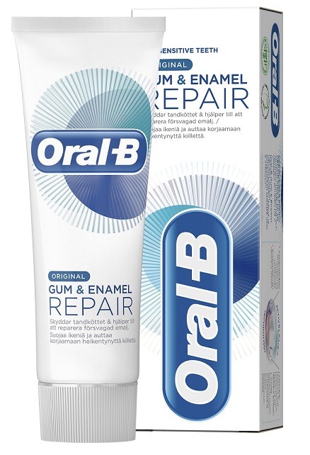 Oral-B Gum & Enamel Repair Original är en tandkräm för känsliga tänder. Gum & Enamel Repair hjälper till att vitalisera tandkött och reparera emaljen. Tandkrämens ActivRepair-teknologi har en antibakteriell verkan och hjälper till att vitalisera tandköttet, skydda emaljen och skydda mot erosion.